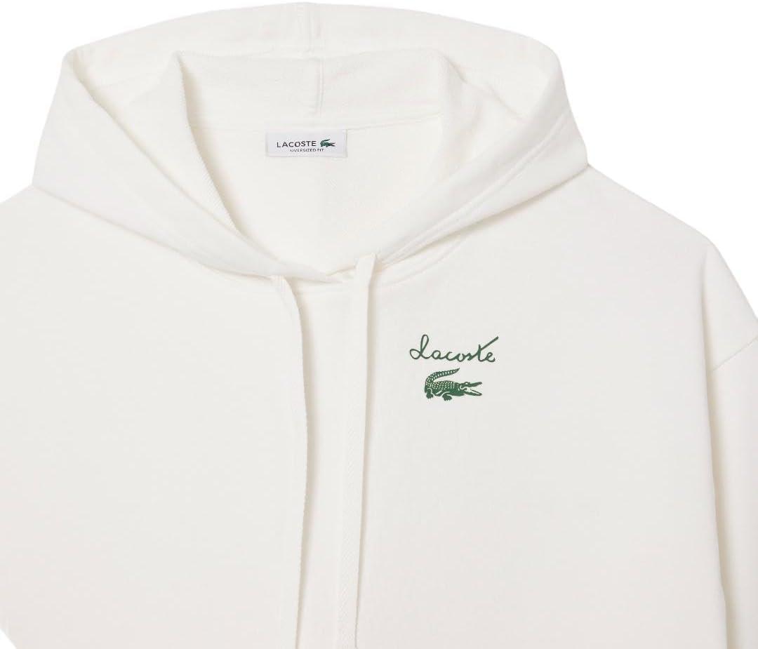 Color combinations and graphics for a Lacoste dynamic and creative identity. Cotton is a natural fiber, it keeps the body warm Oversized fit : Comfortable ease on body and lower shoulder Fleece hoodie with 3D Lacoste wording and crocodile print on chest Tone on tone drawstring Can be worn with XF2566 Embroidered 2,5cm embroidered green crocodile sewn above rib cuff
