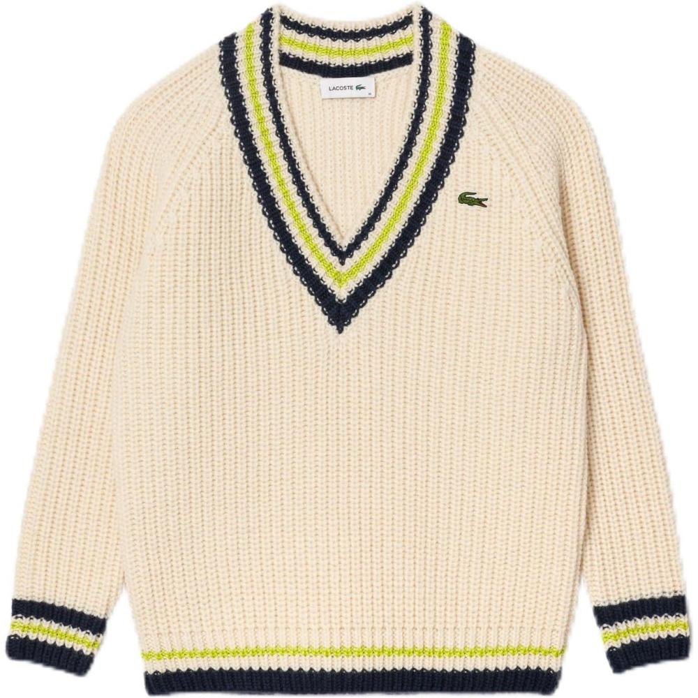 Lacoste Women’s V-Neck Pullover Sweater(Cream/Lime and Navy Stripe)